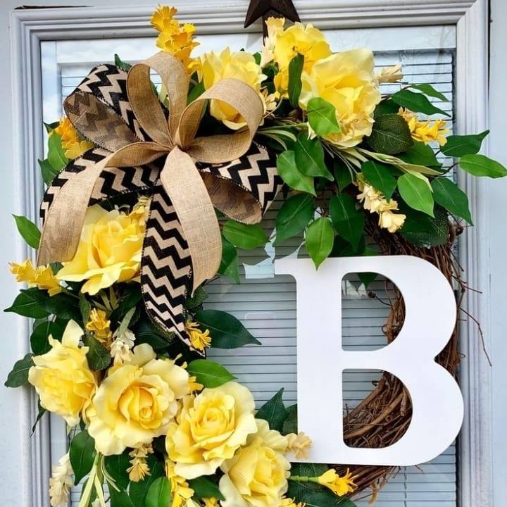 Corona grande, con inicial en letra Bold que simboliza el apellido de la familia, cintas a rayas, rosas amarillas y follaje artificial.